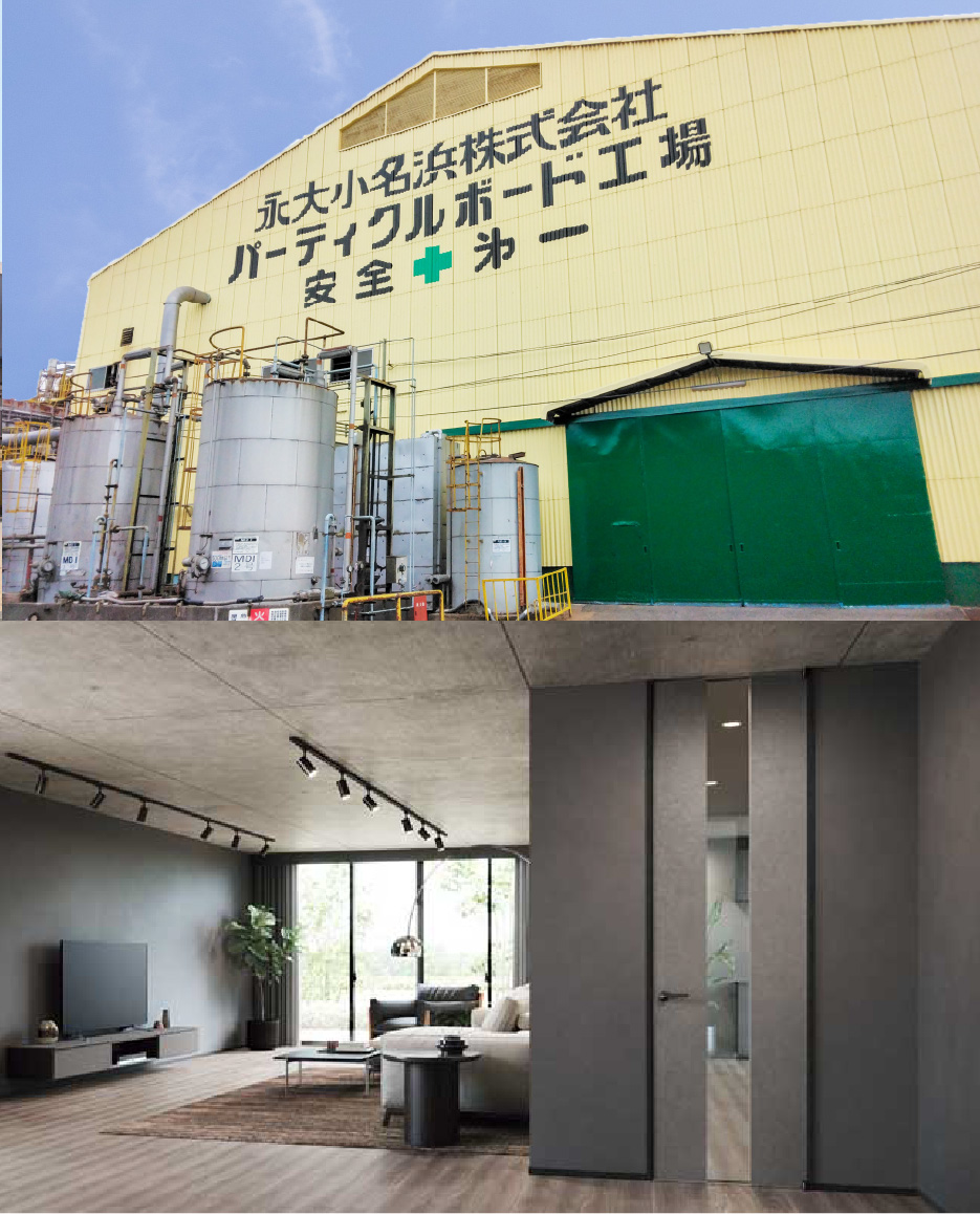 弊社のパーティクルボードは、日本産業規格(JIS A 5908)の認証を受けており、プレハブ住宅、一般住宅、マンション等の床材、ラックの棚板、内装建具、収納家具等の芯材、キッチン、洗面化粧台等のパーツとして幅広く使用されています。