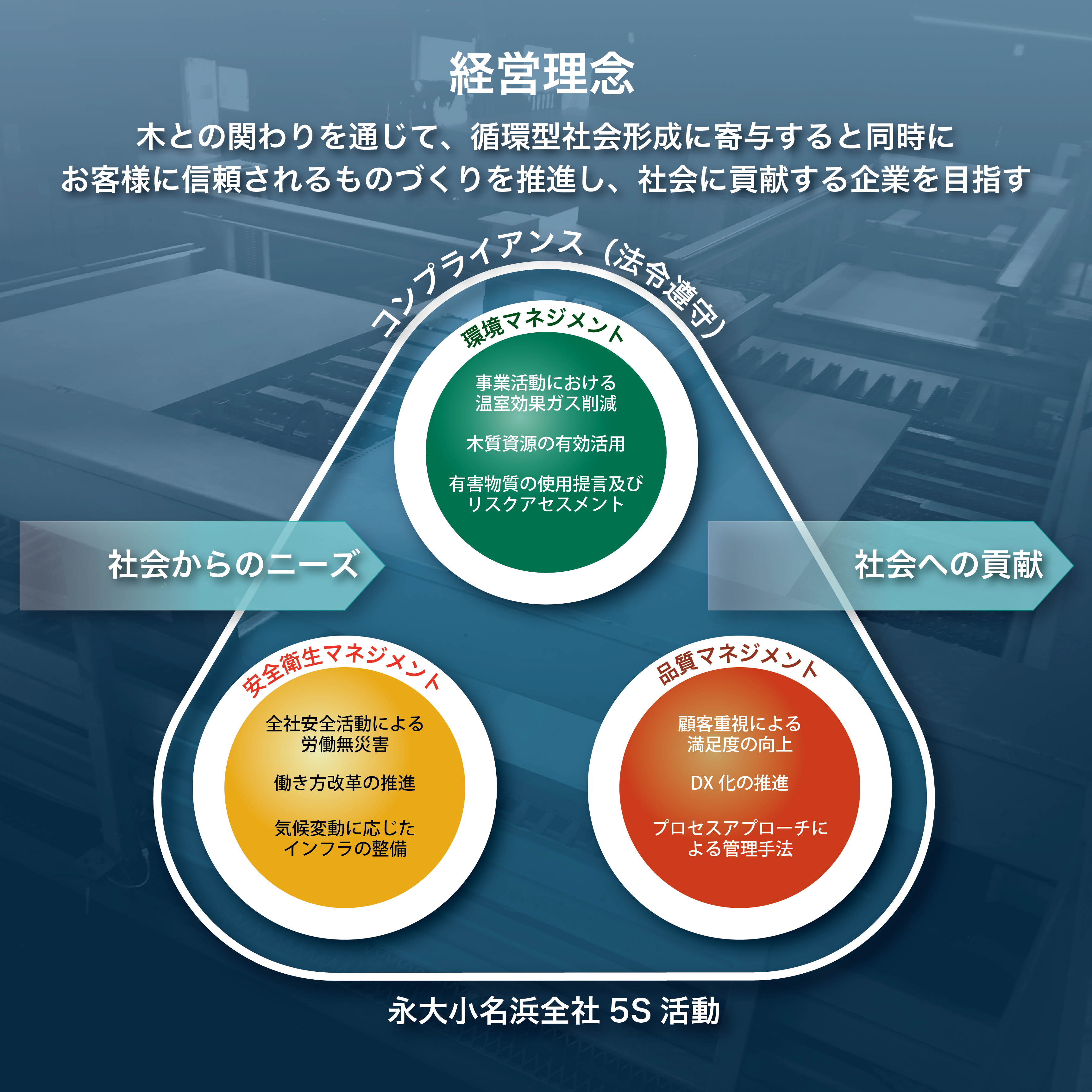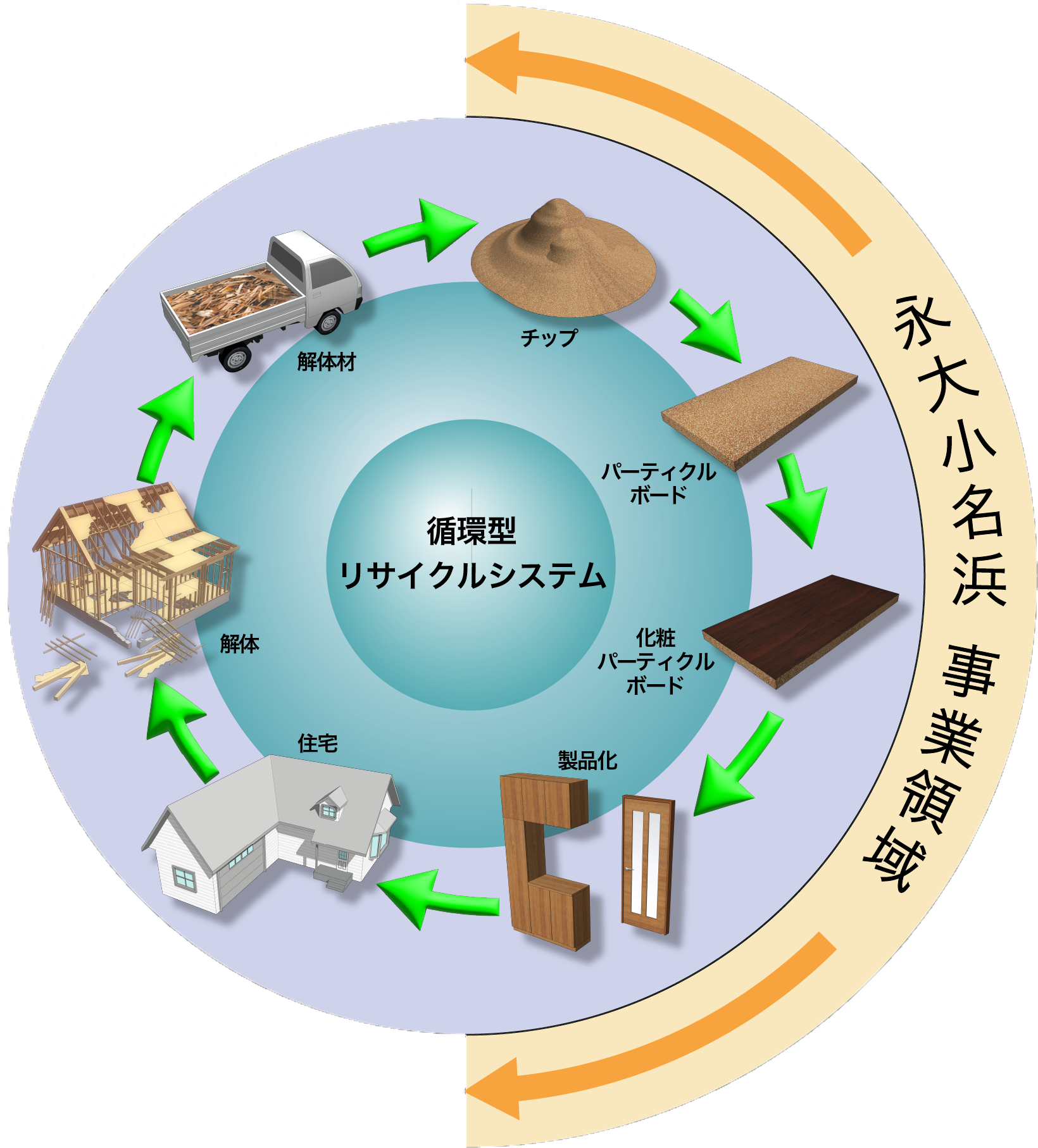 温暖化防止に向け、国土の60%以上が森林の日本にとって、森林の整備はCO₂削減の重要な課題です。しかし、森林の面積確保だけでなく、そこから産出される木質資源にも目を向けることが大切です。国内の木質資源をトータルな視点で活用することで、これまでにないCO₂削減効果を生み出します。そのために永大小名浜は新たな木質資源の循環モデルの構築にチャレンジしています。